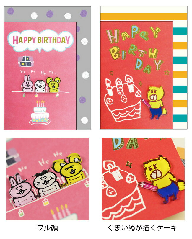 ワル顔のカードはそのまま悪顔の3匹のパーツが、くまいぬが描くケーキのカードはくまいぬのプラバンパーツがアクセントになっています。